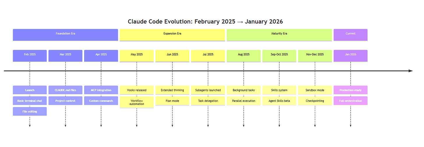 Maturity Era (Aug-Dec 2025) — Background tasks, parallel execution, sandboxing, checkpointing. Production-ready.