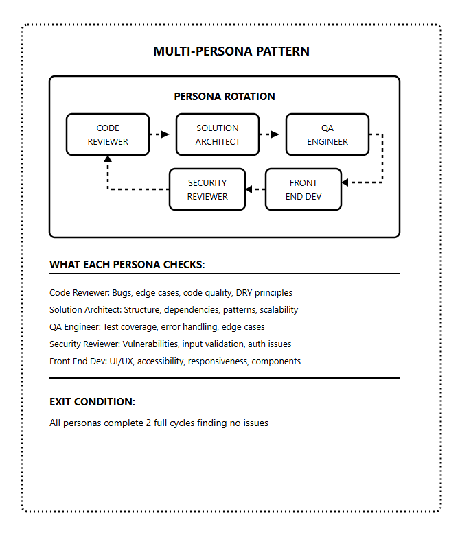 Instead of just building, Claude rotates through different reviewer personas. Each persona catches different issues.
