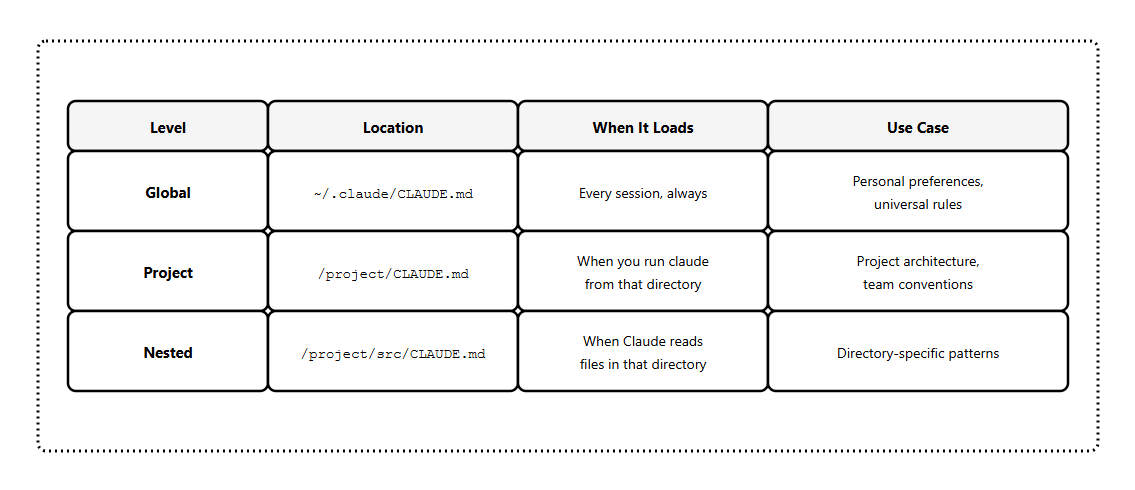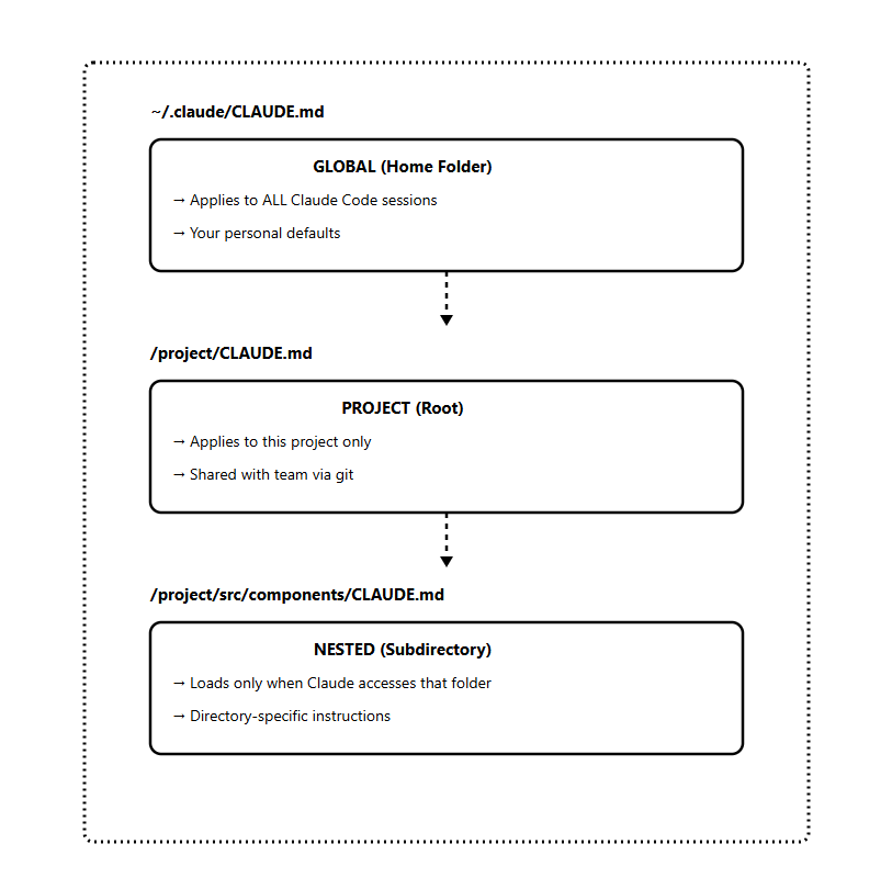 Understanding this hierarchy lets you create global rules that apply everywhere and project-specific rules that apply only where needed.