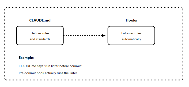 Hooks are automated actions that run at specific points in Claude’s workflow. Your CLAUDE.md can reference and coordinate with them.